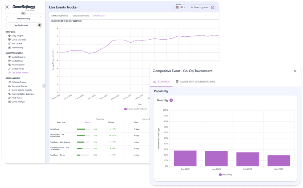 Let GameRefinery’s dedicated team of analysts do the heavy lifting for you. Specialized analysts track live events and their impact on a daily basis and report back with screenshots, event descriptions, and more.